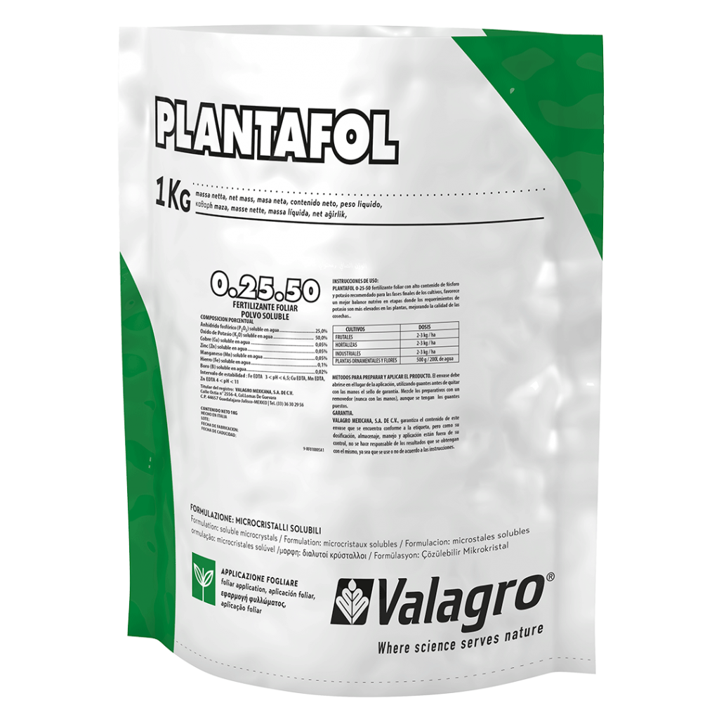 Es un fertilizante foliar con alto contenido de fósforo y potasio recomendado para las fases finales de los cultivos, favorece un mejor balance nutrivo en etapas donde los requerimientos de potasio son más elevados en las plantas, mejorando la calidad de las cosechas.