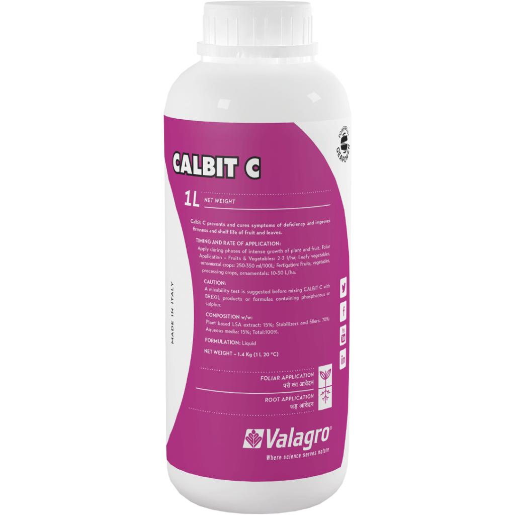 Promueve la rápida translocación de calcio en frutas y flores. No fitotóxico para tratamientos tempranos. Miscible con los pesticidas más comunes. CALBIT C es un suplemento nutricional a base de calcio complejado con LSA.